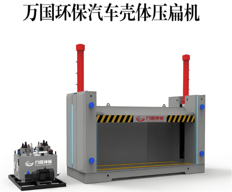 压扁机是一种利用巨大液压压力,将报废车辆压缩成扁平状金属块的重型设备。它通过一个或多个强大的液压油缸驱动压头向下运动,将放置在密闭或半密闭箱体中的车辆压扁。